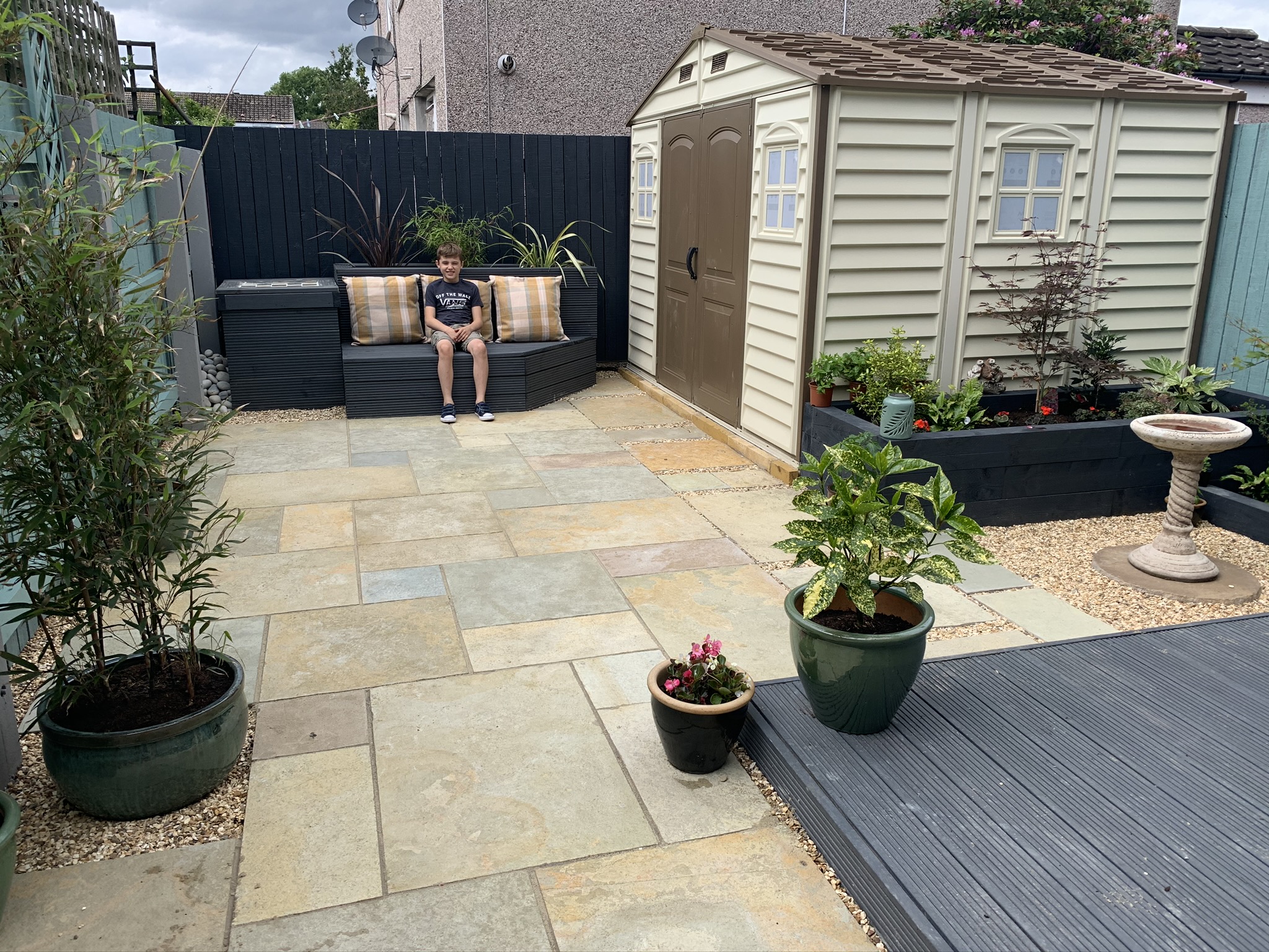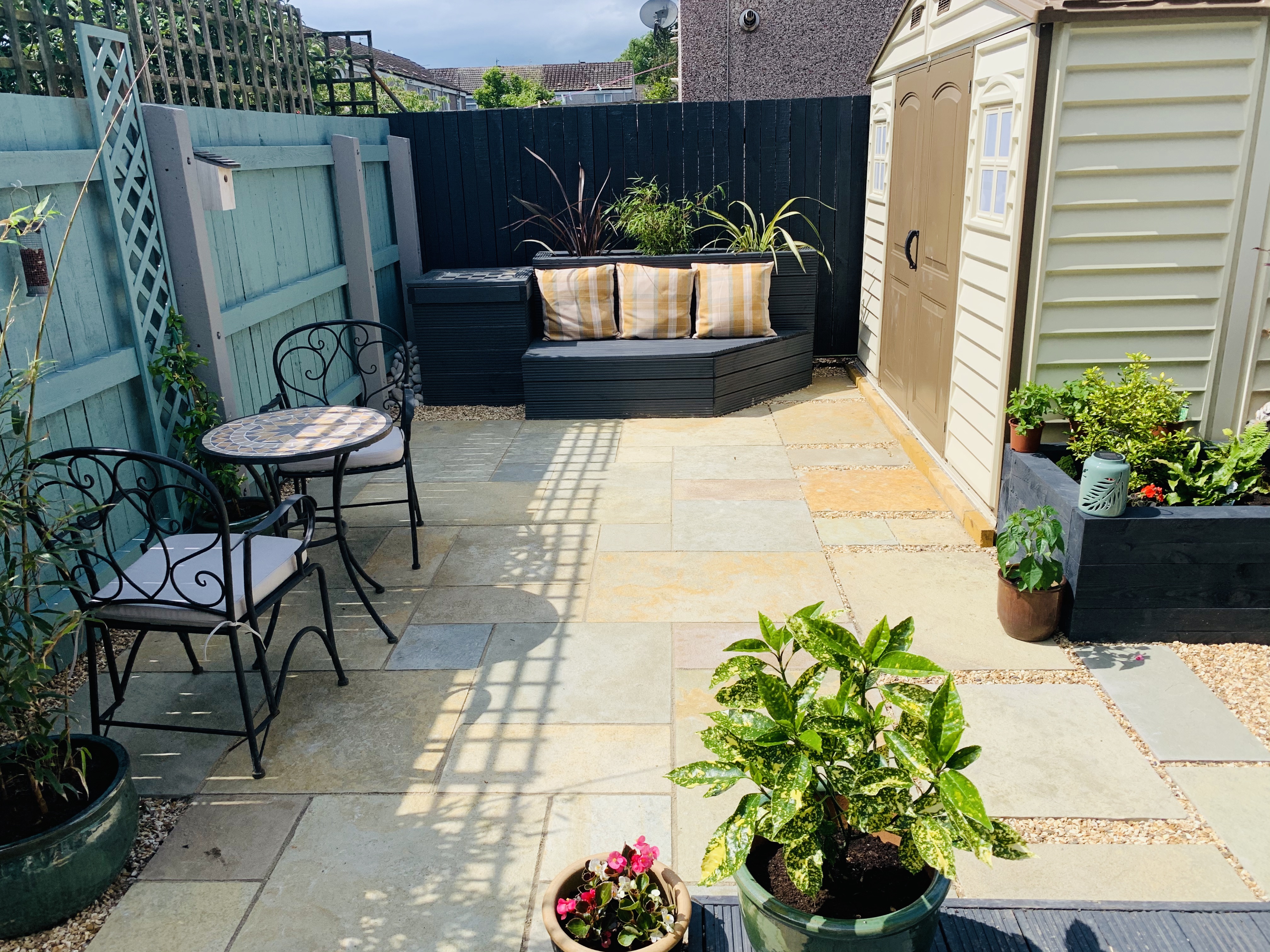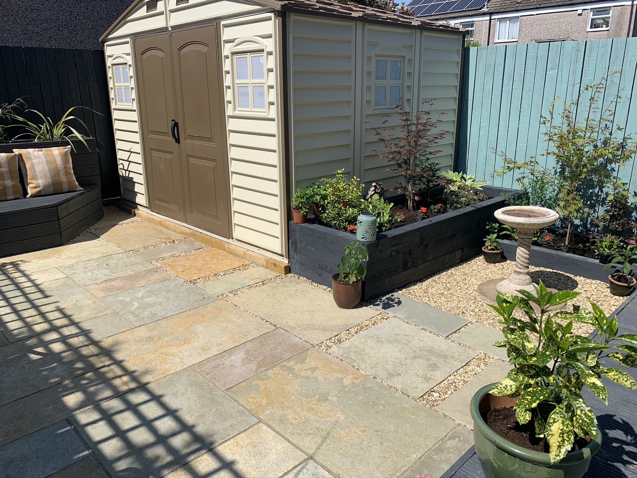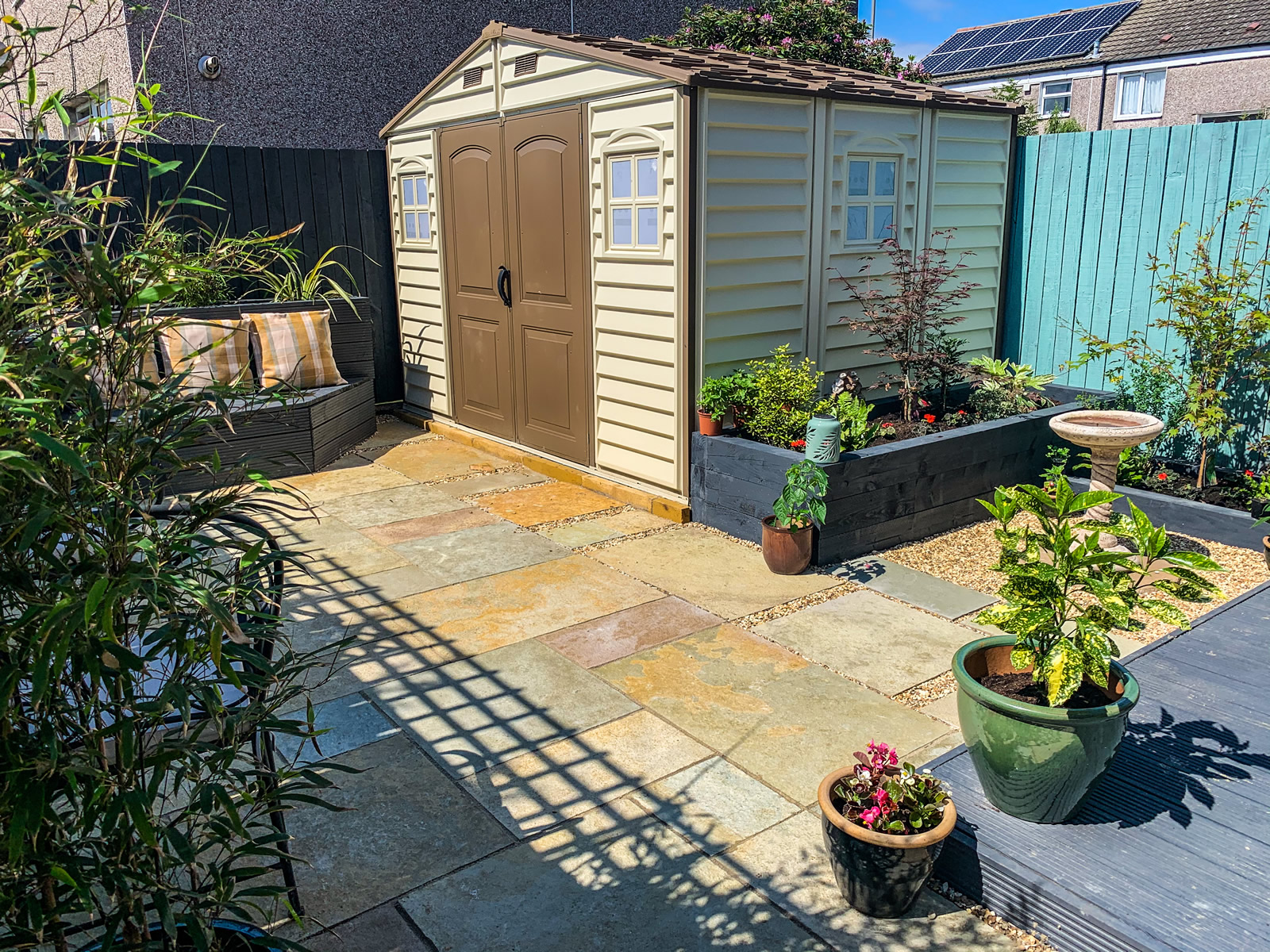When the design was finalised we proceeded with the construction which again, was challenging as it was in the midst of the Covid pandemic when lockdowns and sourcing materials difficult to negotiate. We set about clearing the site then creating the shed base and erecting the shed as a starting point. Next we prepared the ground and laid the flags. Once that was done we could build the timber platers and seating.